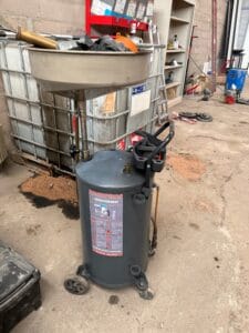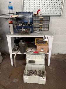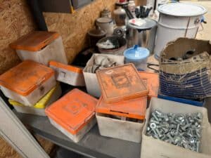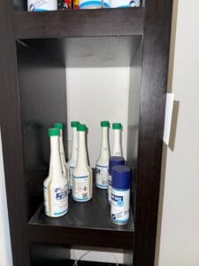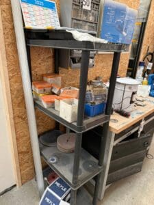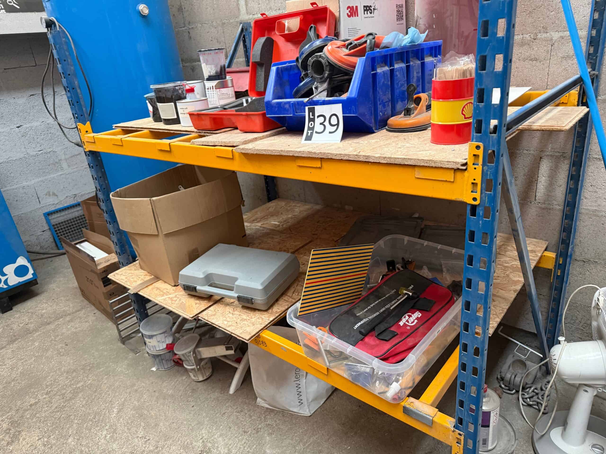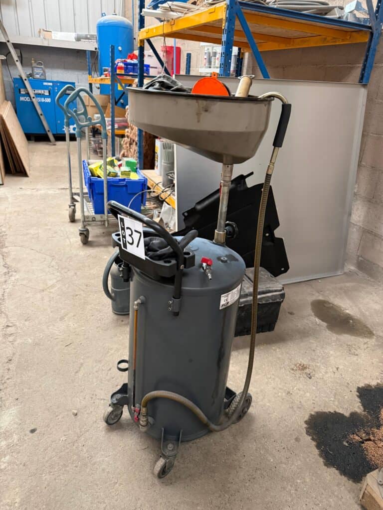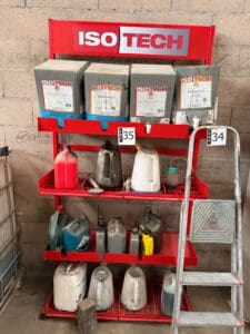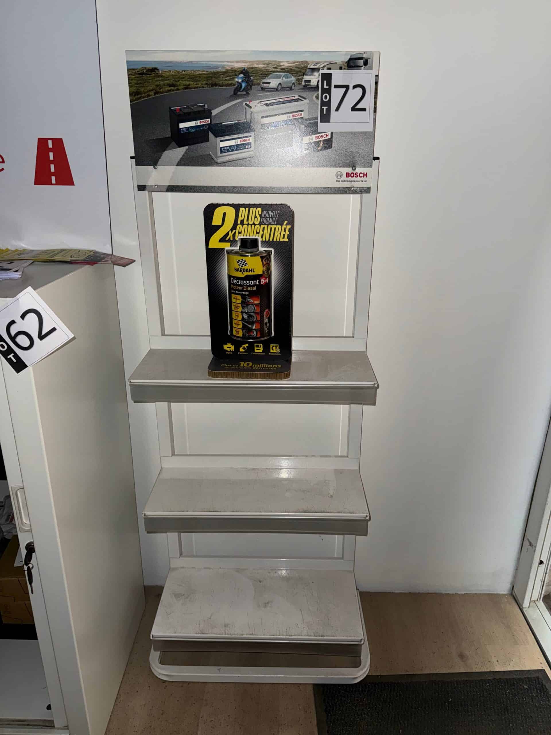 Bar à huiles sur étagère métalliques à 4 niveaux, avec restes de bidons d'huile 5W30, 5W40, 5W30 C3V, 0W30 C2F