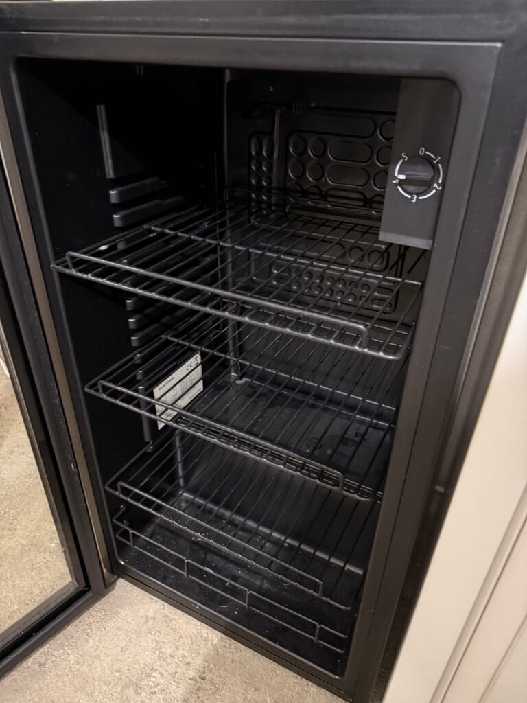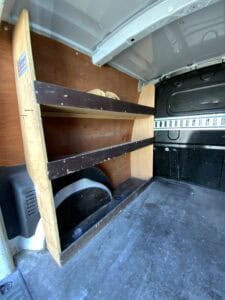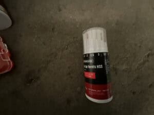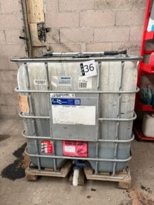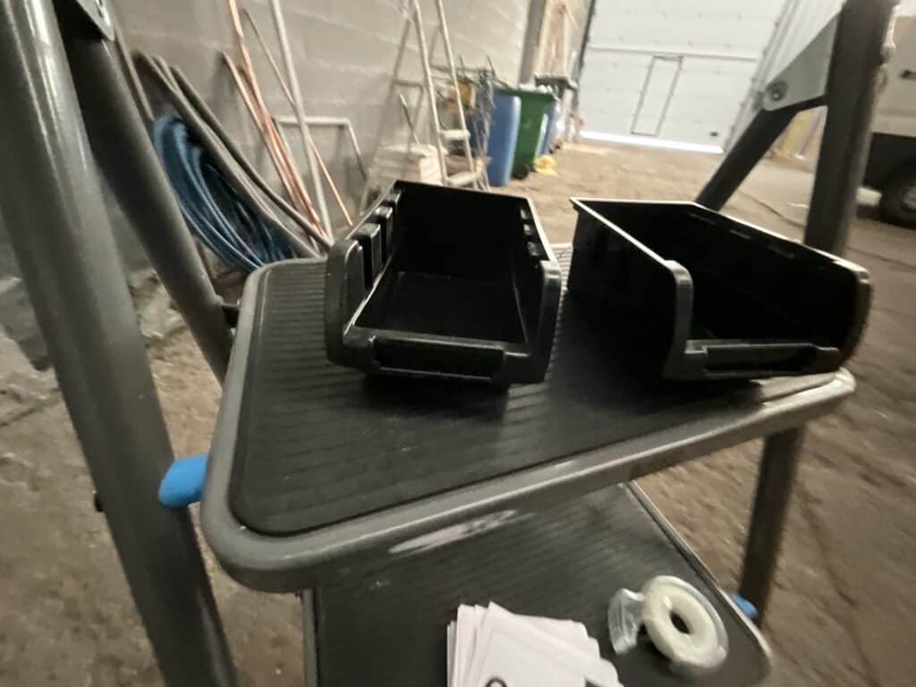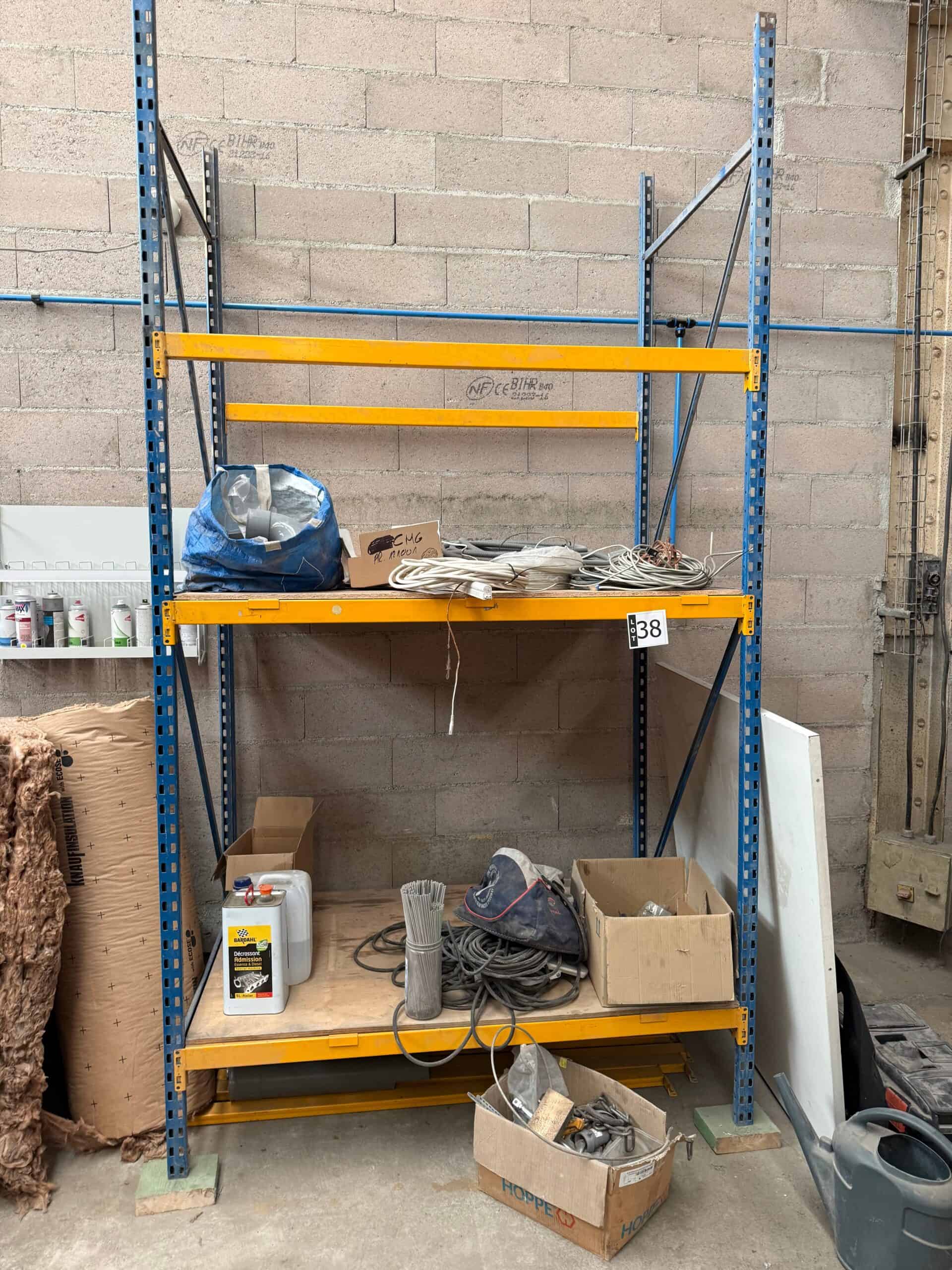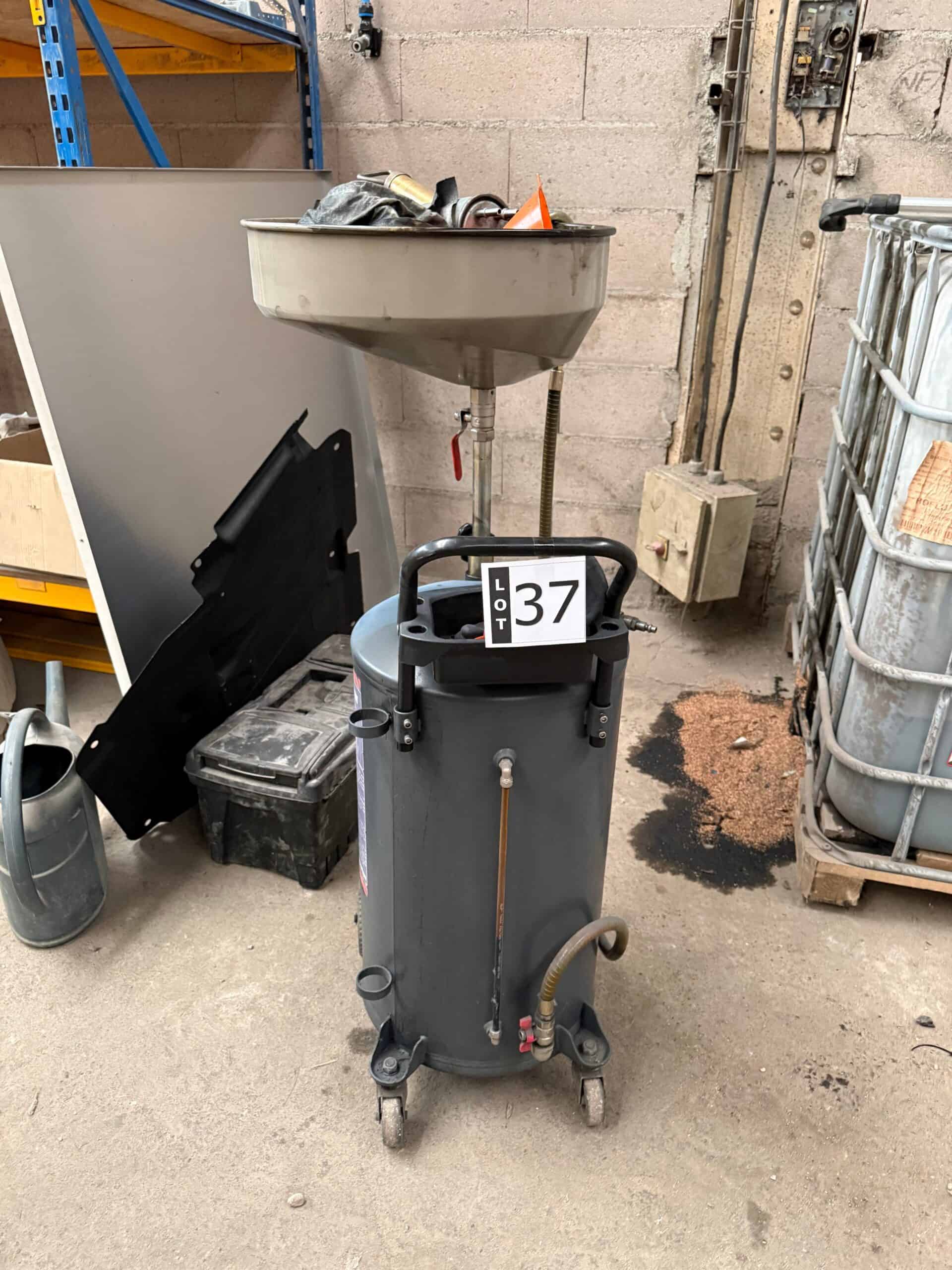 Bar à huiles sur étagère métalliques à 4 niveaux, avec restes de bidons d'huile 5W30, 5W40, 5W30 C3V, 0W30 C2F