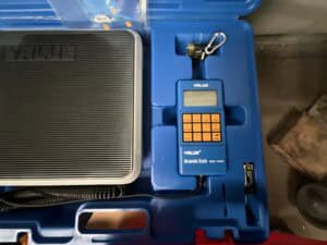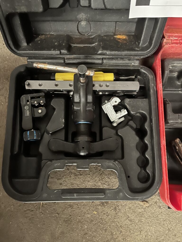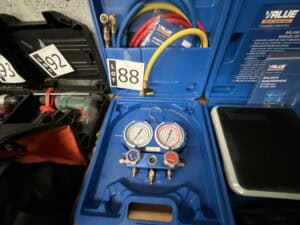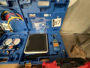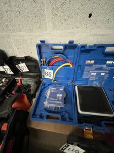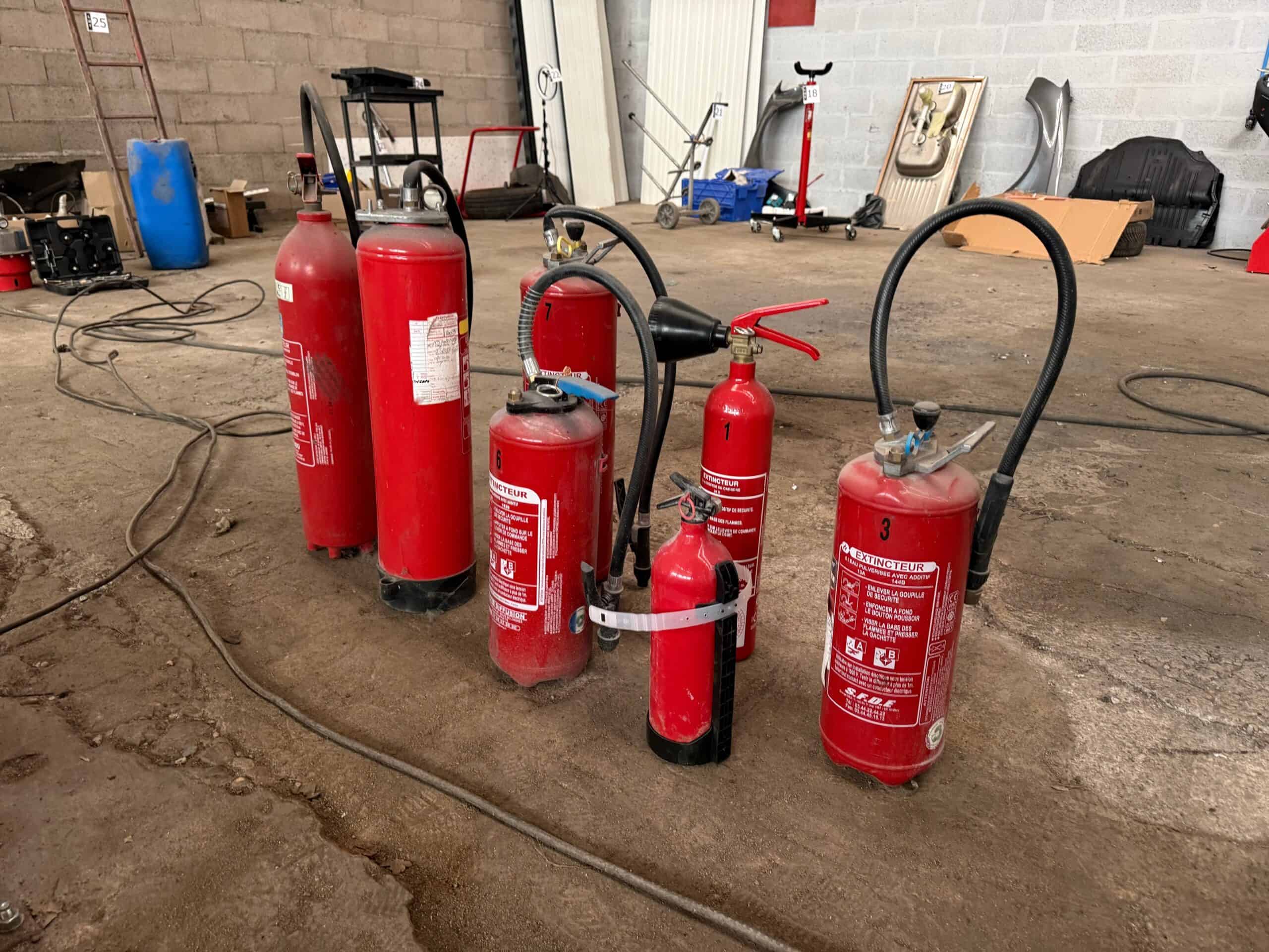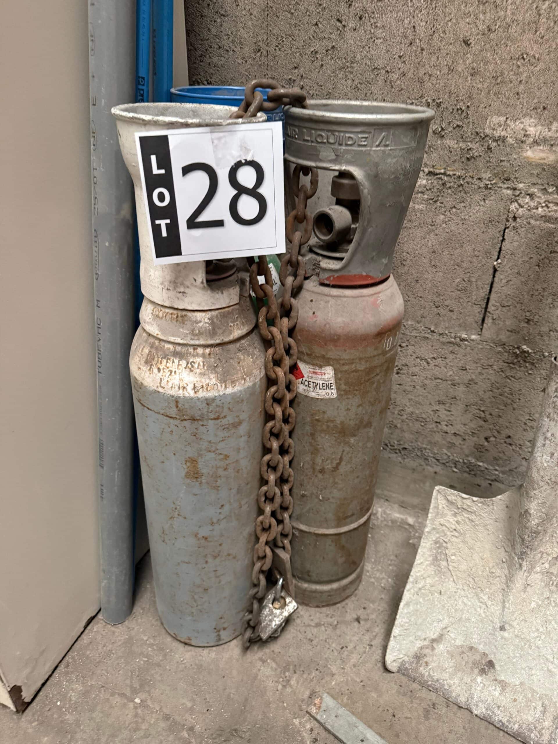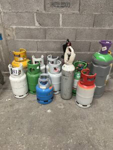 Lot de 12 bouteilles de gaz entamées comprenant : 2 bouteille de transfert (gazechim),1 bouteille gaz réfrigérant R 32, 1 bouteille gaz azote hydrogène, 1 bouteille acétylène, 1 bouteille d'oxygène, 3 bouteille R407, 1 bouteille R404, 1 bouteille R410, 1 bouteille de récupération
