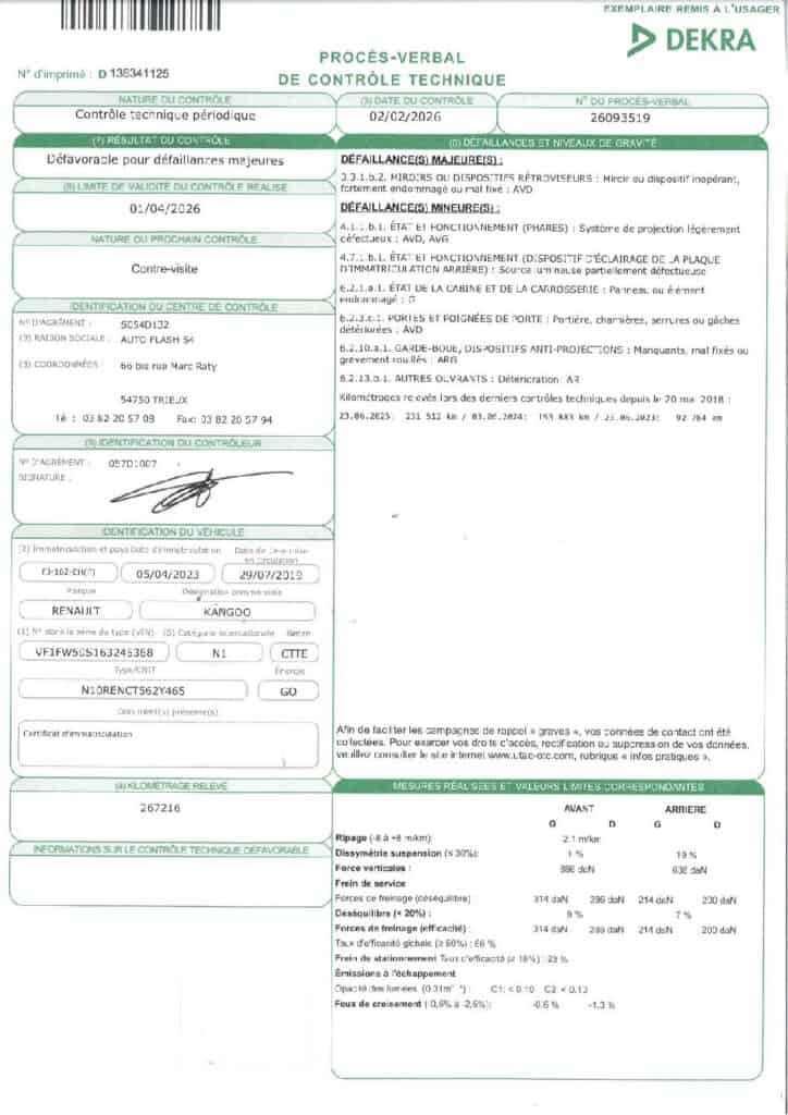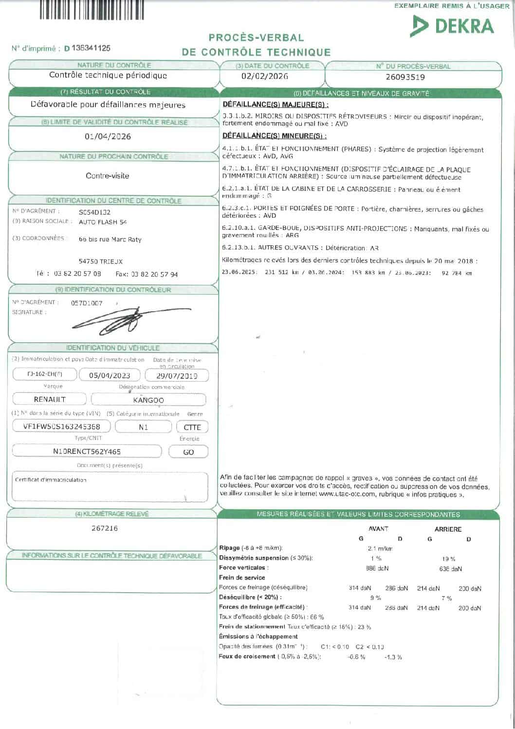 RENAULT Kangoo II Express Phase 2 (VU) 1.5 dCi Energy 670kg S&S 75 cv, immatriculé, FJ-162-EH, 1 MEC le 29/07/2019 , 267 216 KM, portière AVD endommagée