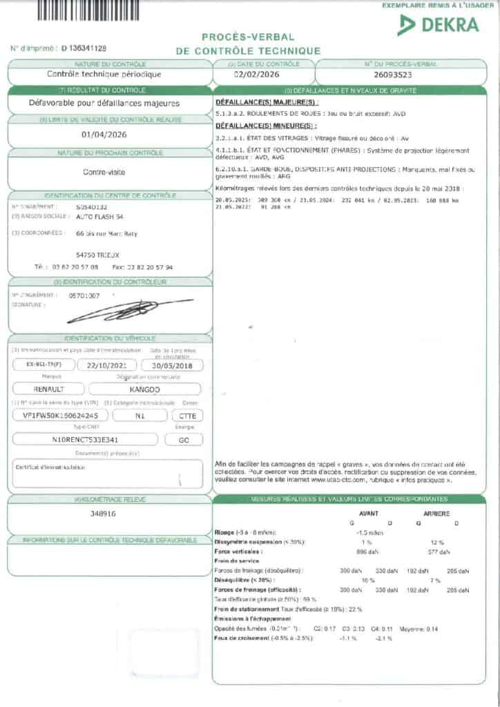 RENAULT Kangoo II Express Phase 2 (VU) 1.5 dCi Energy Extra R-link 520kg S&S 75 cv, immatriculé EX-951-TA, 1 MEC le 30/05/2018, 348 896 KM