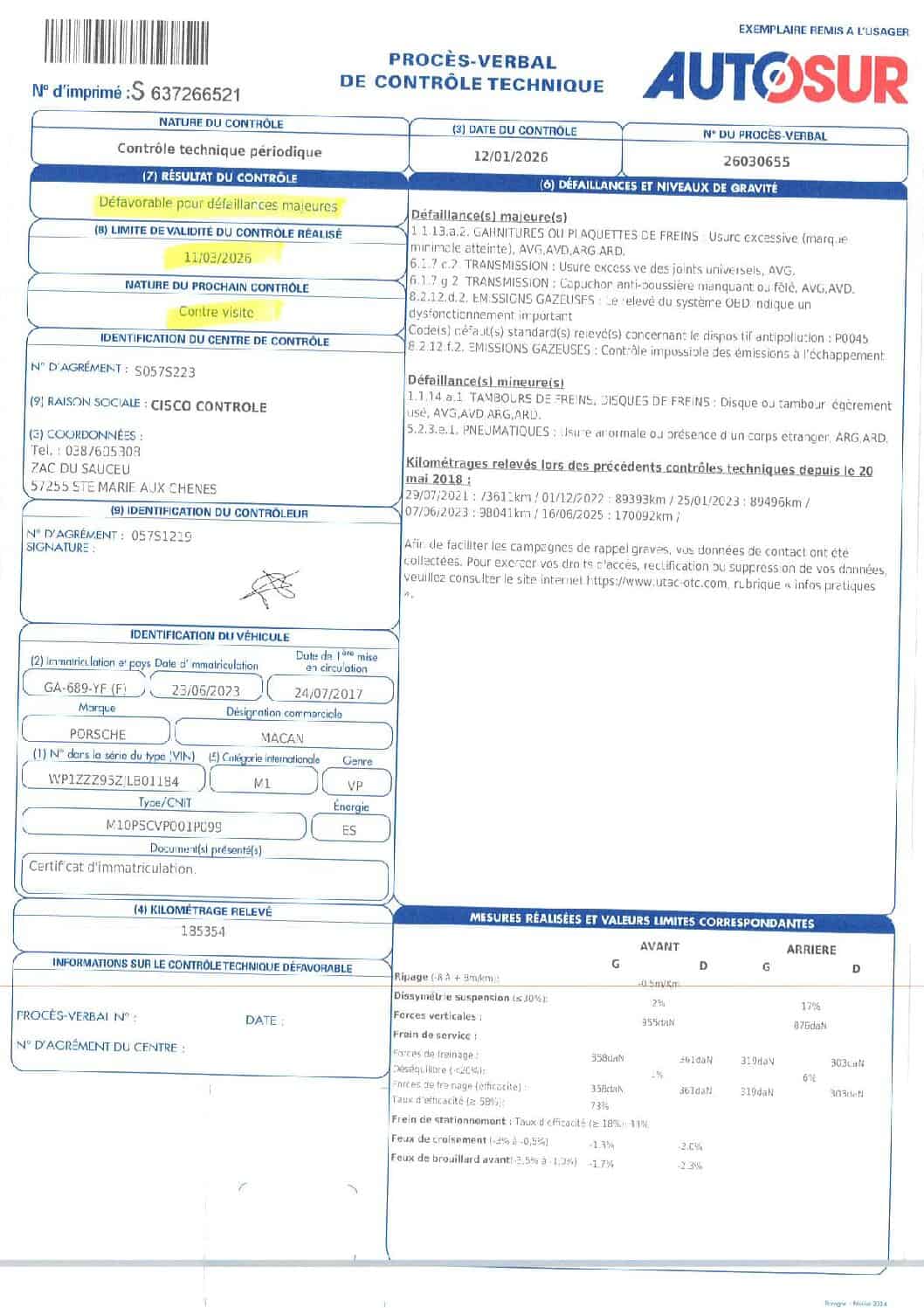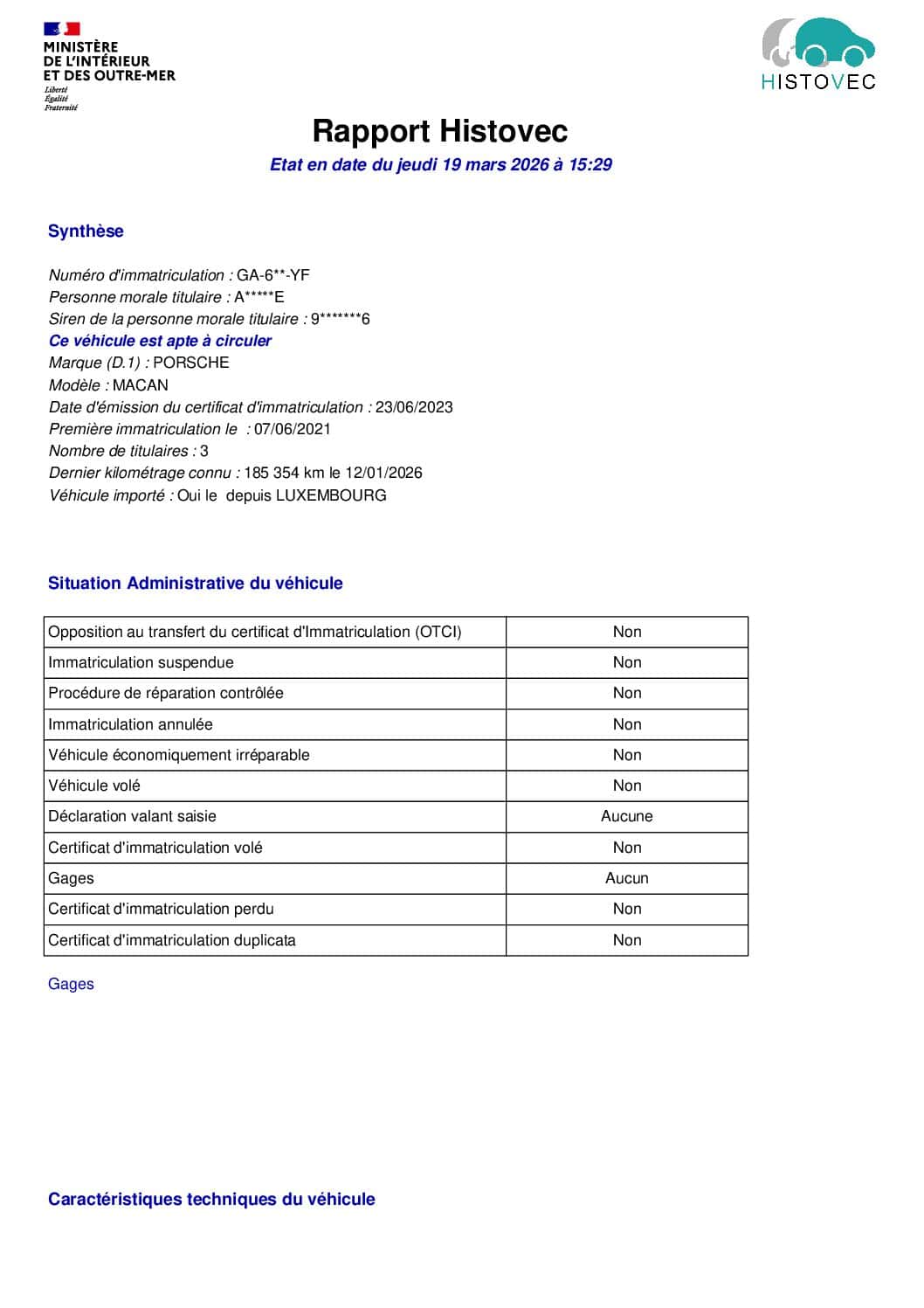 PORSCHE Macan (95B) 2.0 TFSI 16V AWD PDK 252 cv Boîte auto, immatriculé GA-689-YF, convertis à l'éthanol E85, DMEC le 24/07/2017, km 185 354