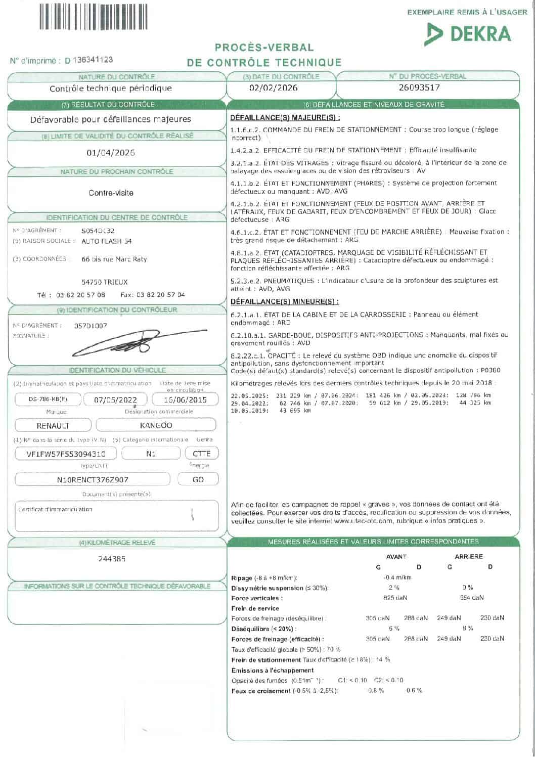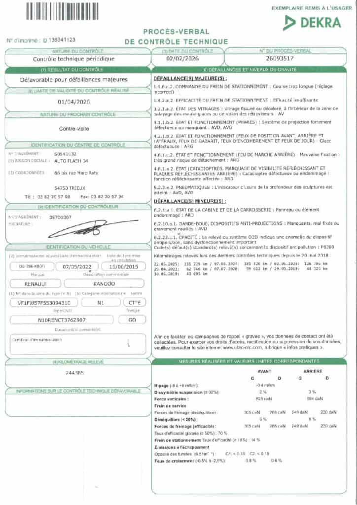RENAULT Kangoo, II Express Compact Phase 2 (VU) 1.5 dCi FAP 75 cv ENERGY GRAND CONFORT, DS-786-KB, 1MEC le 16/06/2015, 244 385 KM