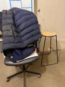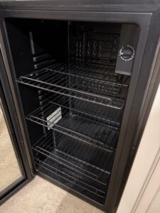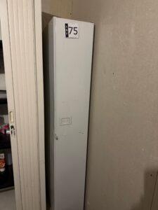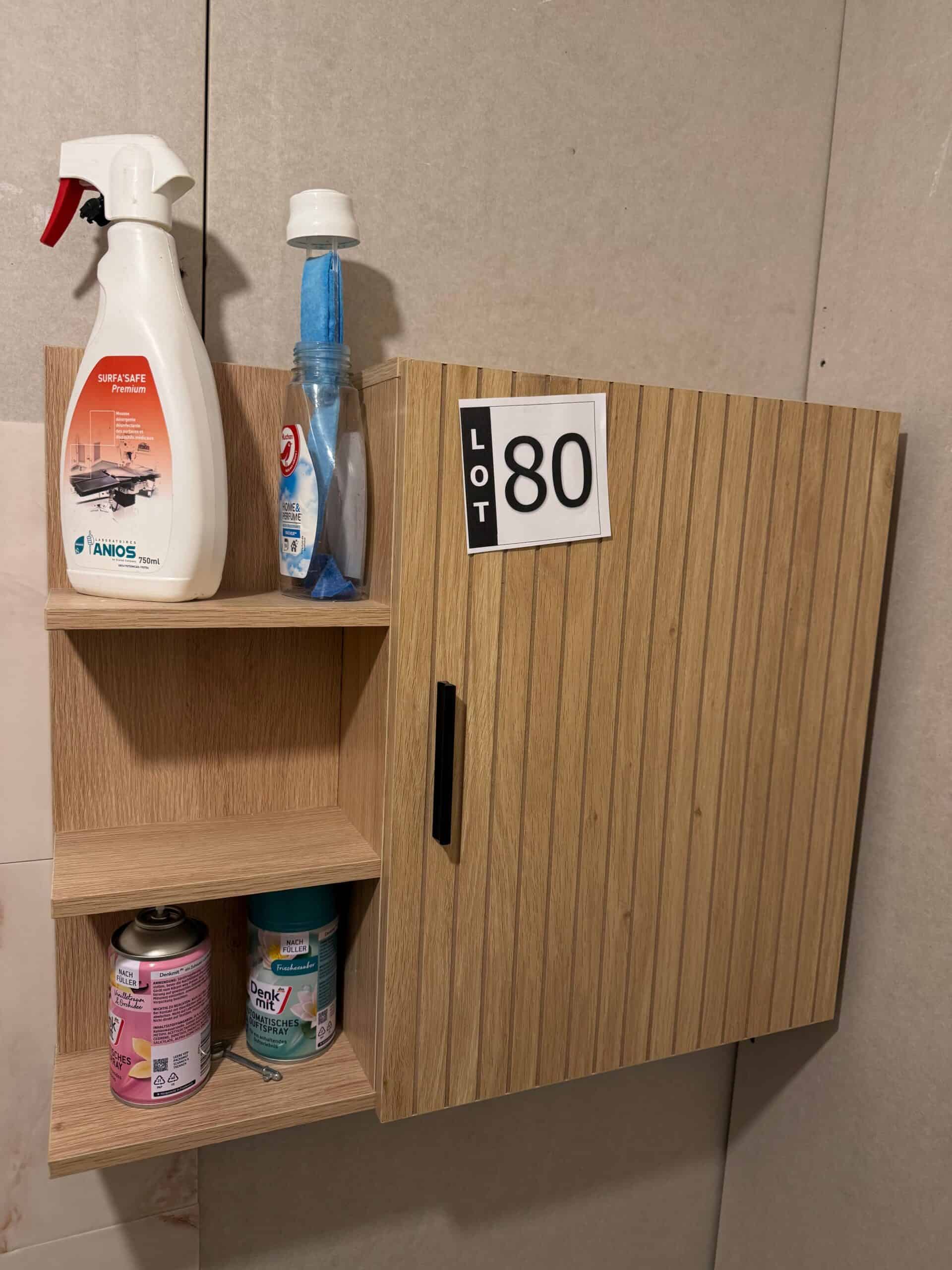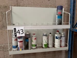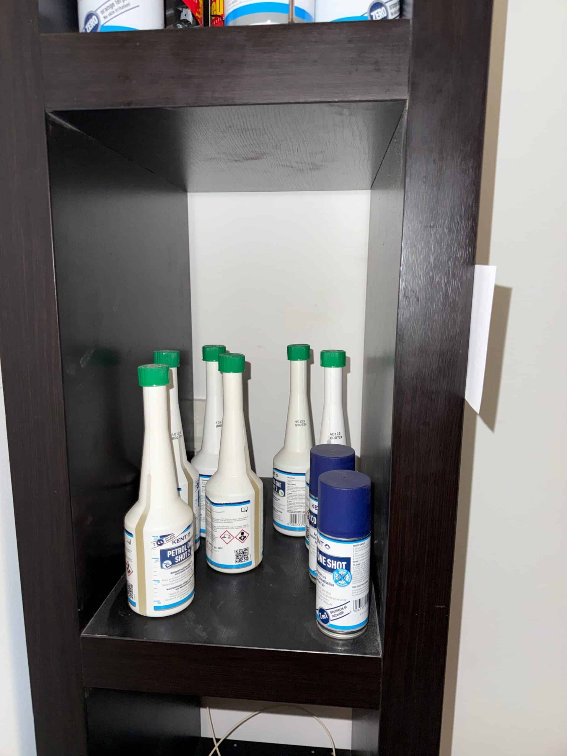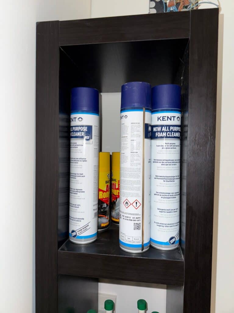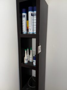 Meuble colonne en mélaminé contenant des bombes aérosol de nettoyant, répulsif de rongeurs et à divers