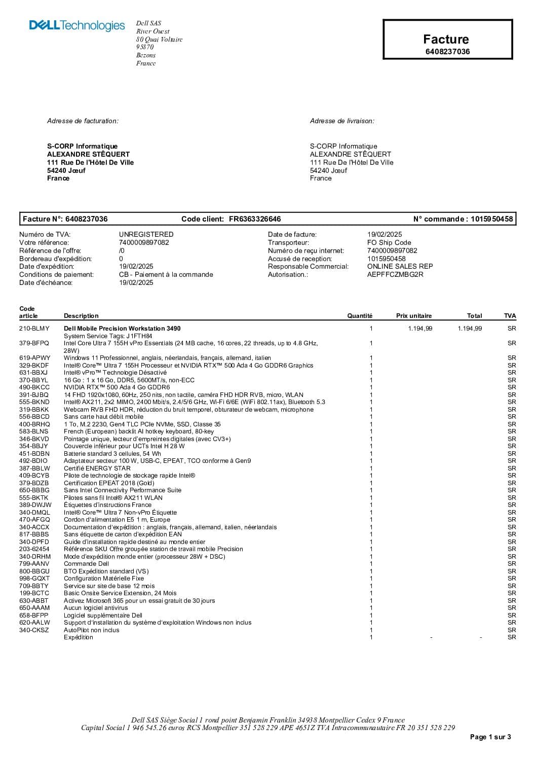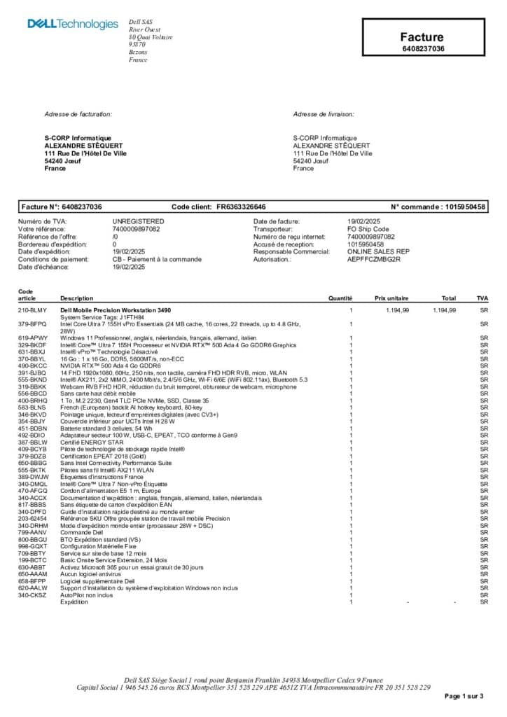 PC portable Dell Latitude 7490 14" Core i5 1.7 GHz - SSD 512 Go - 20 Go AZERTY avec sacoche, date d'achat le 27/02/2025