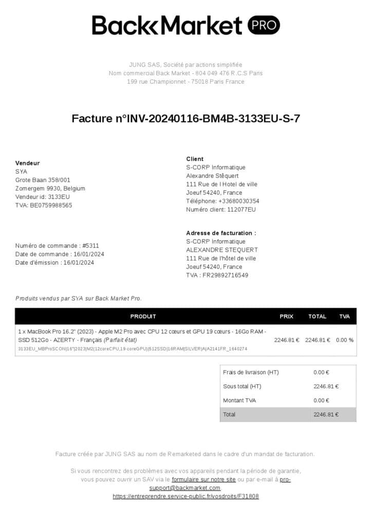 PC portable MacBook Pro 16.2" (2023) - Apple M2 Pro avec CPU 12 coeurs et GPU 19 coeurs - 16Go RAM -SSD 512Go - AZERTY, avec sacoche, date d'achat le 16/01/2024