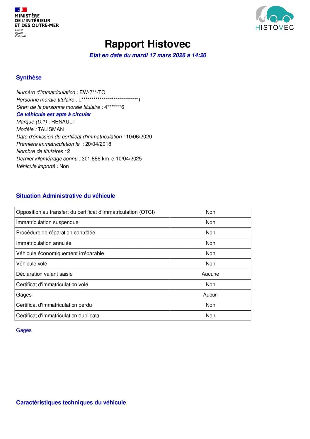 RENAULT Talisman - Estate 1.6 dCi 16V EDC6 131 cv Boîte auto immatriculé EW-762-TC, 1ère MEC le 20/04/2018, 339 109 KM