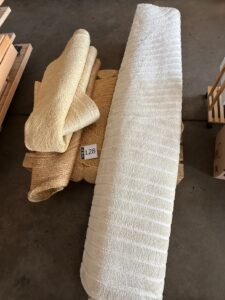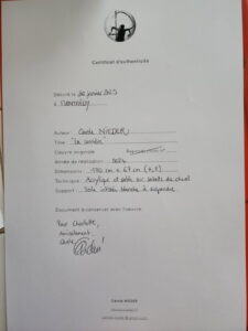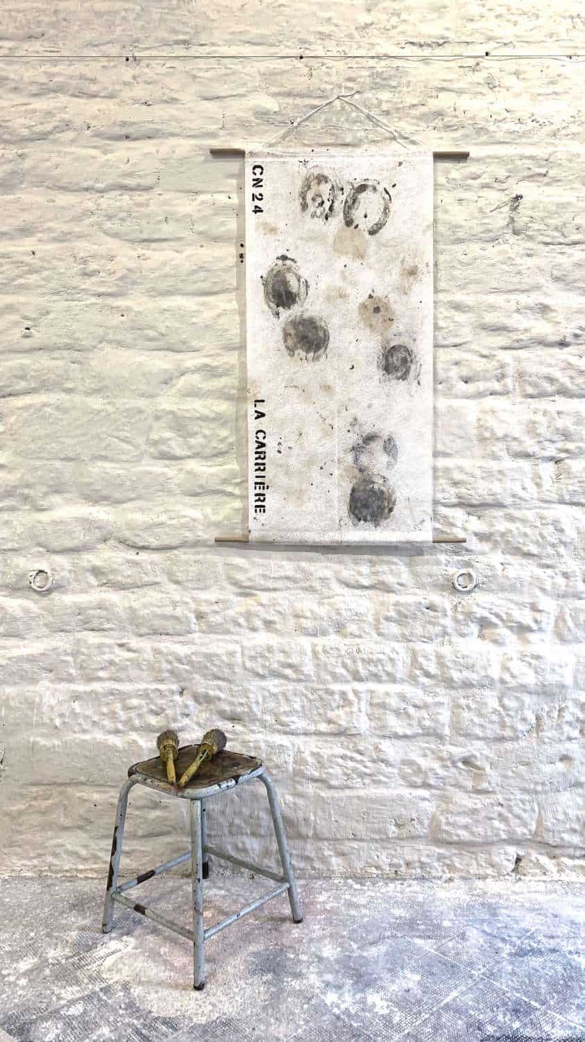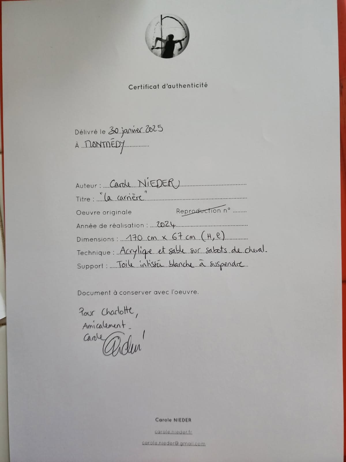1 Toile représentant des pas d'un cheval de l'artiste Carole NIEDER avec certificat d'authenticité, intitulée "La carrière". Dimensions 170cm x 67cm. Technique : acrylique et sable sur sabots de cheval. Support : Toile intissée blanche à suspendre. Année 2024