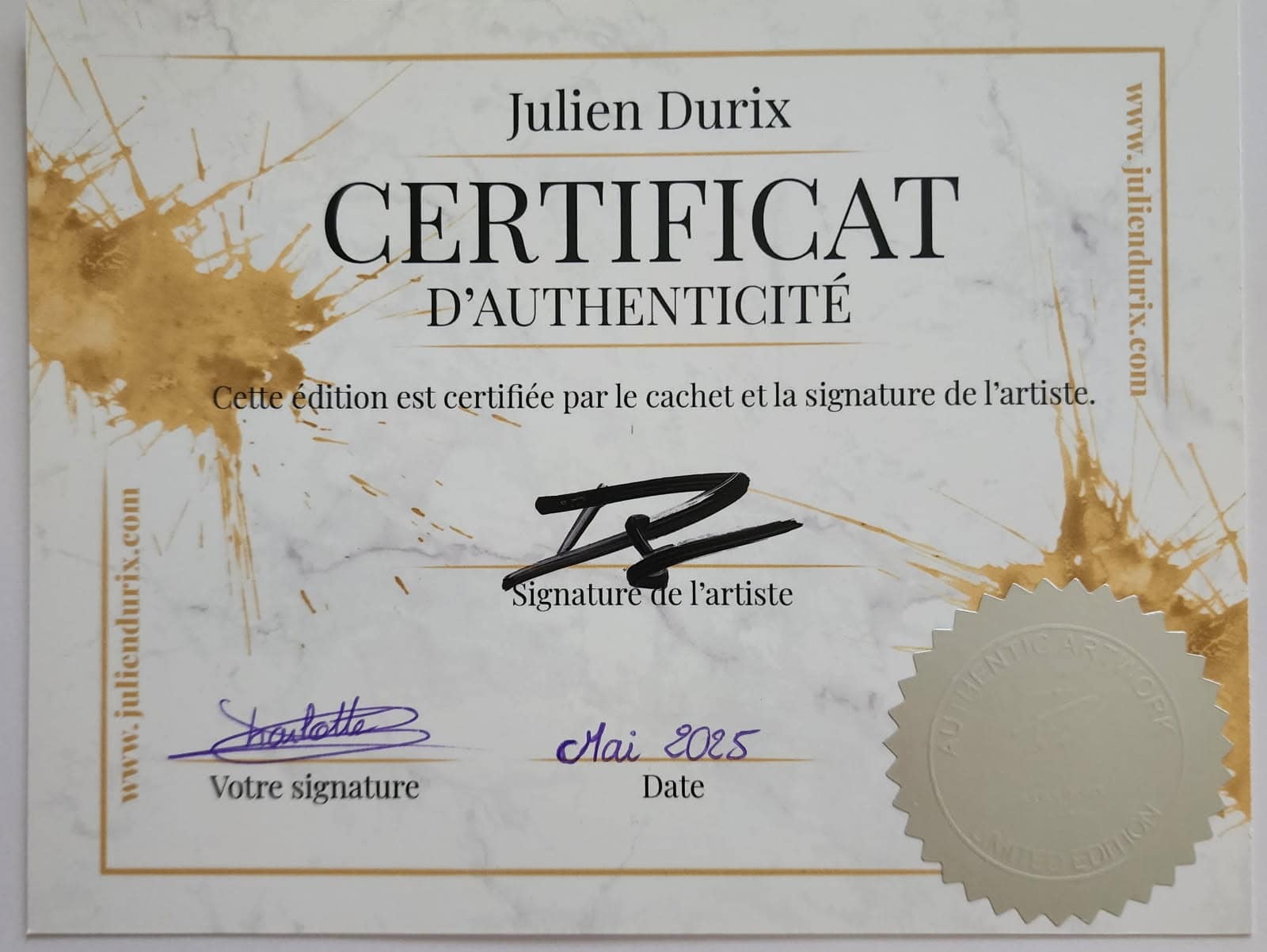 Reproduction d'œuvre par tirage d'art haute fidélité sur papier musée 225gr. 1 exemplaire encadré sur 250. Année 2024. Certificat d'authenticité de l'artiste Julien DURIX.