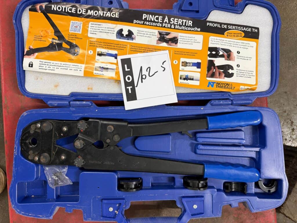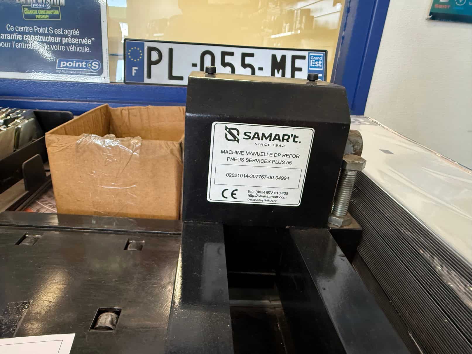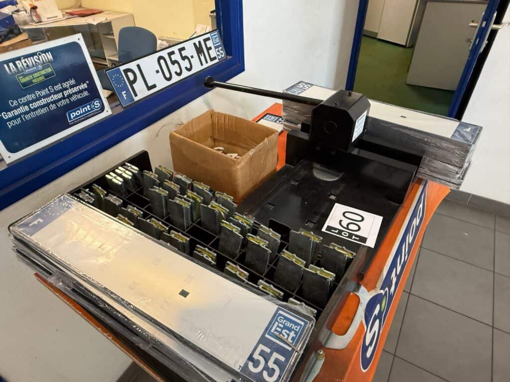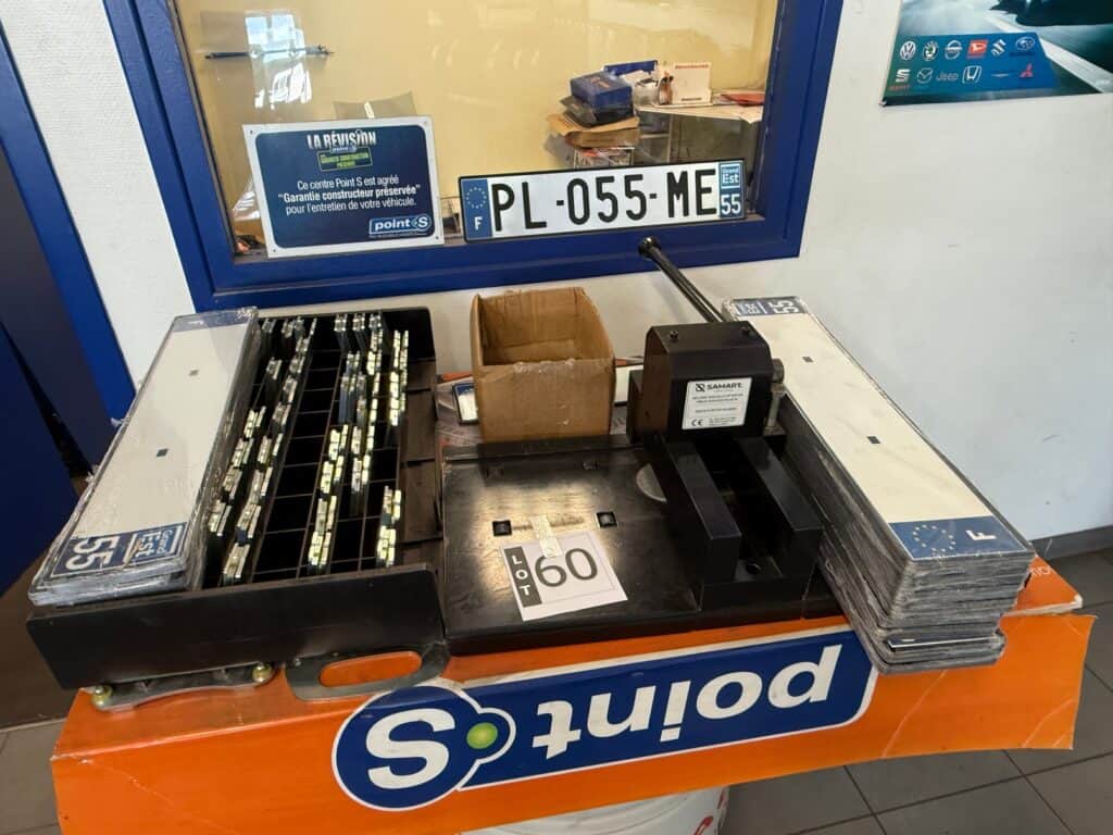 Lot de matériel d’immatriculation comprenant plaques minéralogiques neuves, supports, caractères/lettres et machine manuelle de sertissage/emboutissage de plaques de marque SAMART, avec accessoires