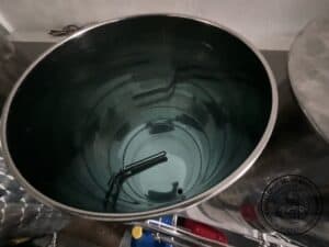 Cuve en inox de brassage motorisée POLSINELLI avec fond filtrant et moteur, 500 litres, en très bon état.