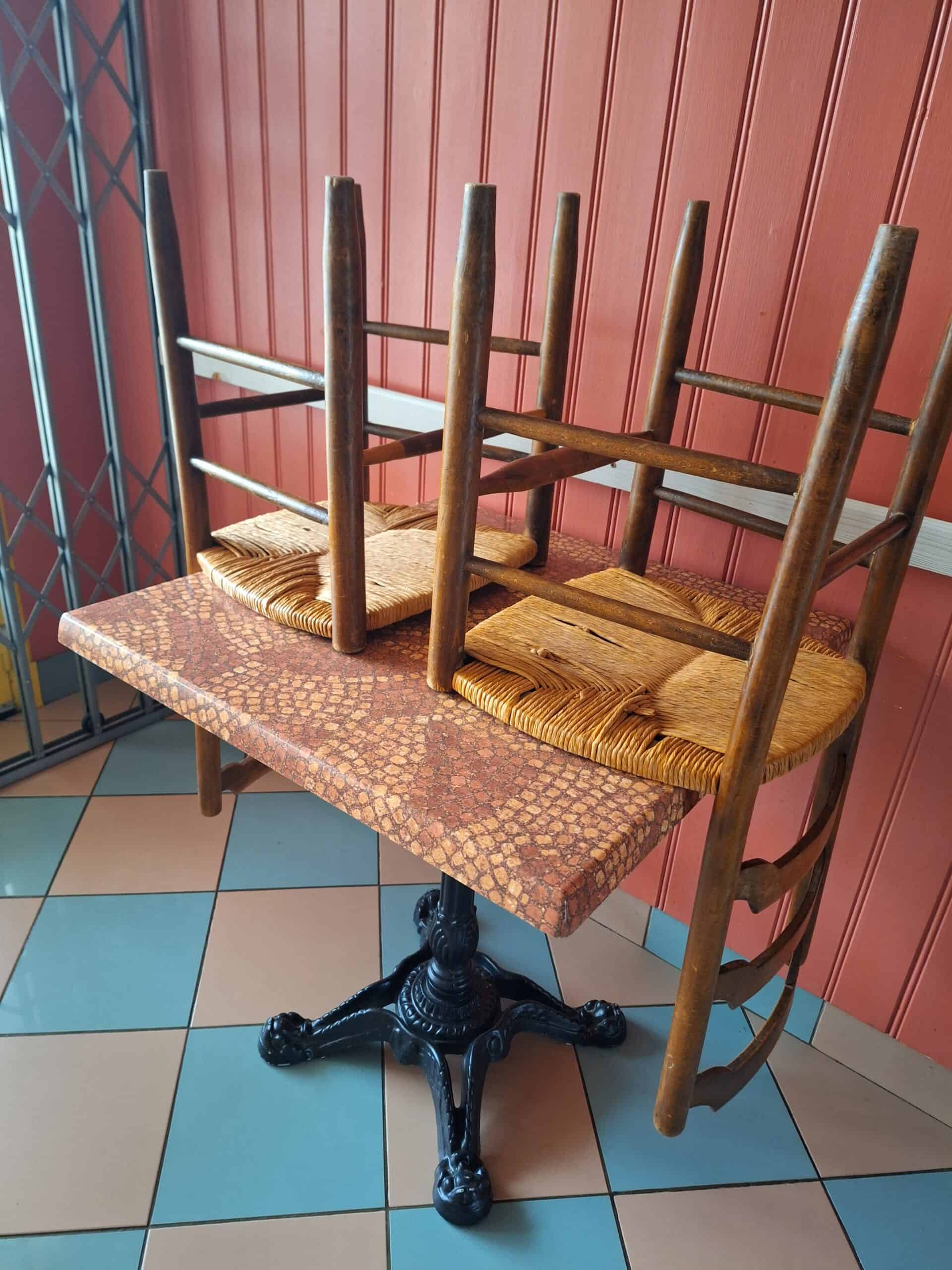 Tables pour deux personnes + chaises en bois avec assise paillée